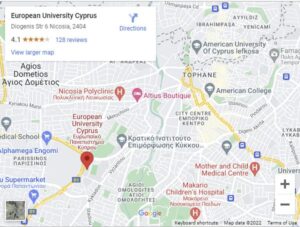 EUC campus is approximately 2,5 kilometres from Nicosia city centre (address: 6 Diogenis Str., 2404 Engomi, 1516, Nicosia-Cyprus).
